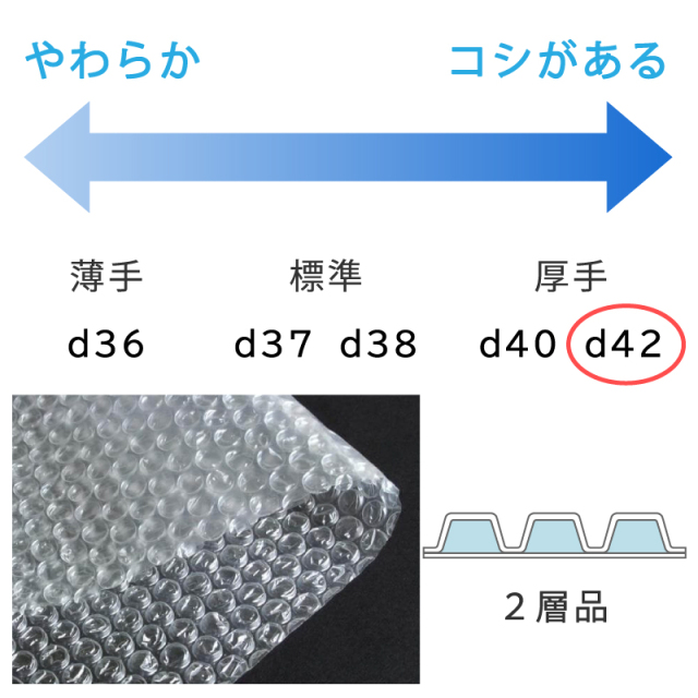 - 2層品で最厚手のプチプチ(d42)緩衝力高めで、壊れやすい物の梱包に。